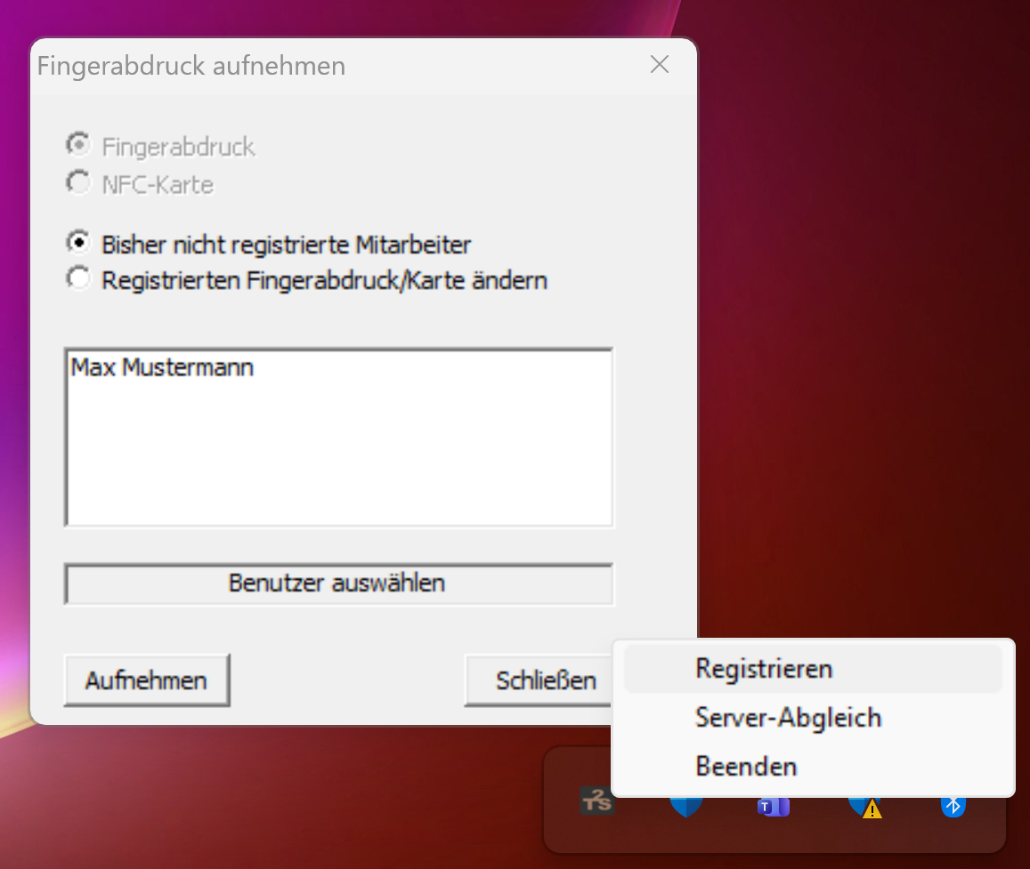 - Je nach dem ob Sie einen Fingerabdruckscanner oder NFC-Kartenleser angeschlossen haben, wird dieser im Menü als aktiv angezeigt