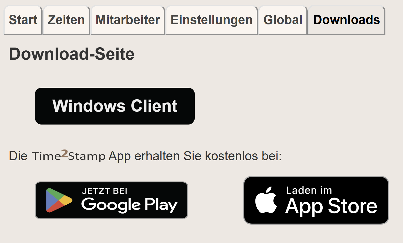Nach der Anmeldung bei Time²Stamp finden Sie oben rechts den Reiter Downloads. Für den lokalen Betrieb eines NFC-Kartenlesers oder Fingerprintreader, laden Sie den Windows Client herunter.